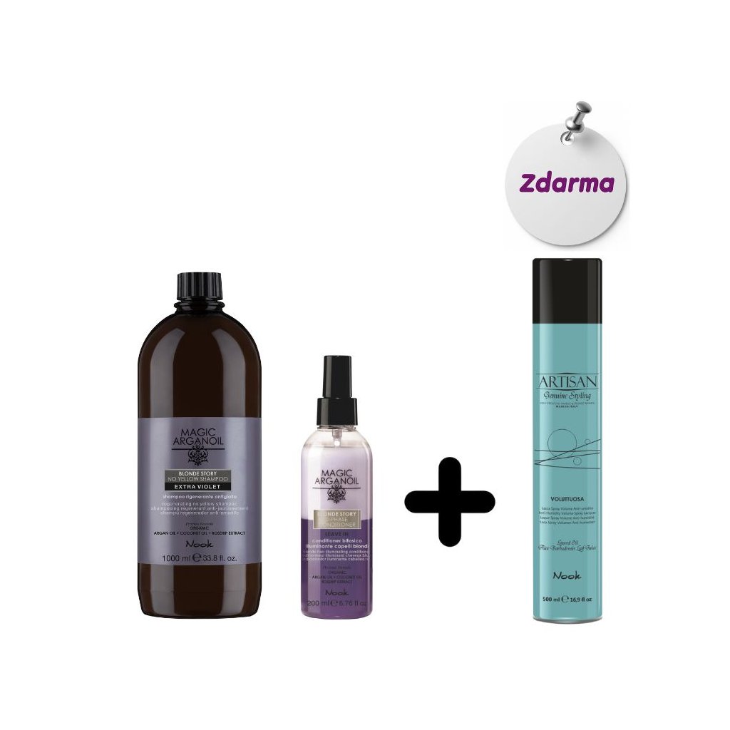 AKCE Nook šampon Blonde Story Extra Violet 1000 ml a dvoufázový kondicionér Blonde Story 200 ml + lak Voluttuosa 500 ml ZDARMA
