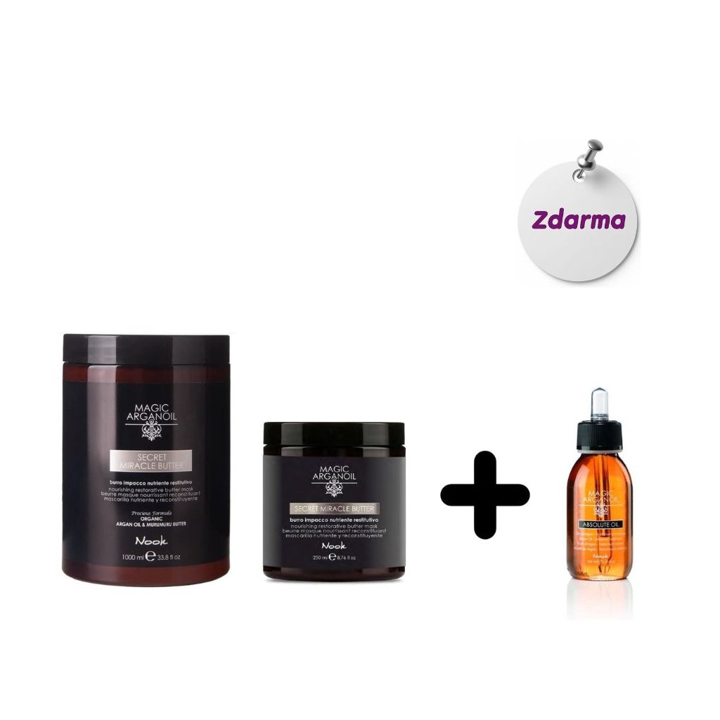 Při koupi 1 ks Nook Secret Miracle Butter masky 1000 ml a 1 ks 250 ml získáte 1 ks Secret Absolue olej 100 ml zdarma. Uhlazující a hydratační péče pro suché vlasy bez lesku.