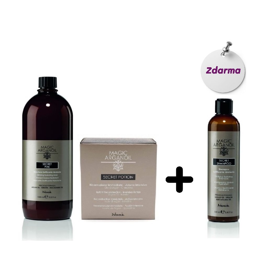 Při koupi 1ks Nook Secret Pak masky 1000 ml a 1ks Nook Secret Potion Reconstruction 9x10 ml získáte Nook Secret šampon 250 ml zdarma. Uhlazující a hydratační péče pro suché vlasy bez lesku.