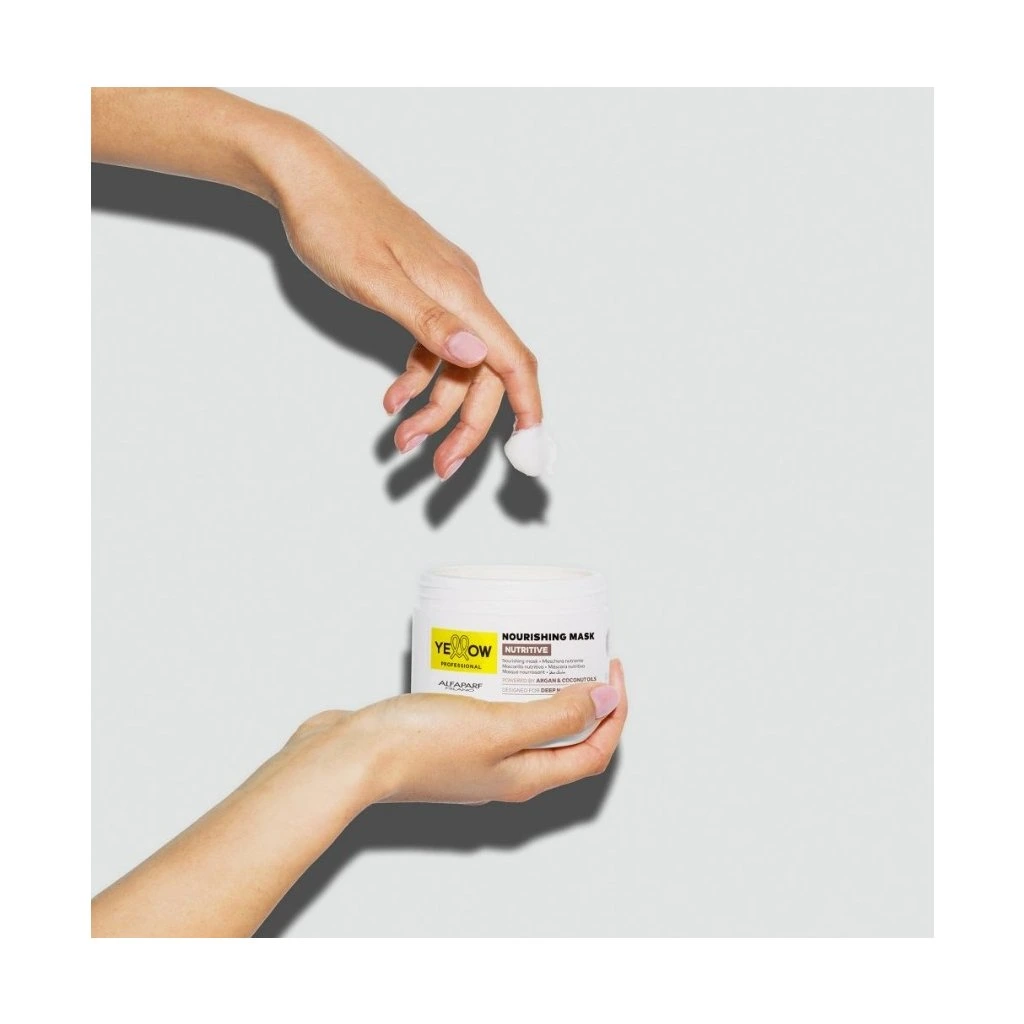 Vyživující maska Alfaparf Yellow Nourishing Nutritive pro extra suché a lámavé vlasy s arganovým a kokosovým olejem. Hloubkově vyživuje a hydratuje během několika minut. Zanechává vlasy hebké a lesklé. Eliminuje krepatění a vlasy jdou snadno rozčesat.