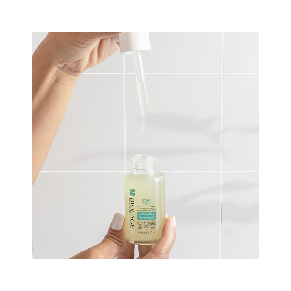 Lehké bezoplachové sérum na vlasy Biolage Scalp Sync s obsahem fermentovaného čaje pohlcuje přebytečný maz a zanechá vlasovou pokožku čistou a svěží. Zároveň vytvoří ochrannou bariéru, která zamezí mazu a nečistotám v jejich šíření po vlasech. Pokožka hlavy bude po použití opět v dokonalé rovnováze a vlasy si zachovají lehkost a vzdušný vzhled. Veganské složení.