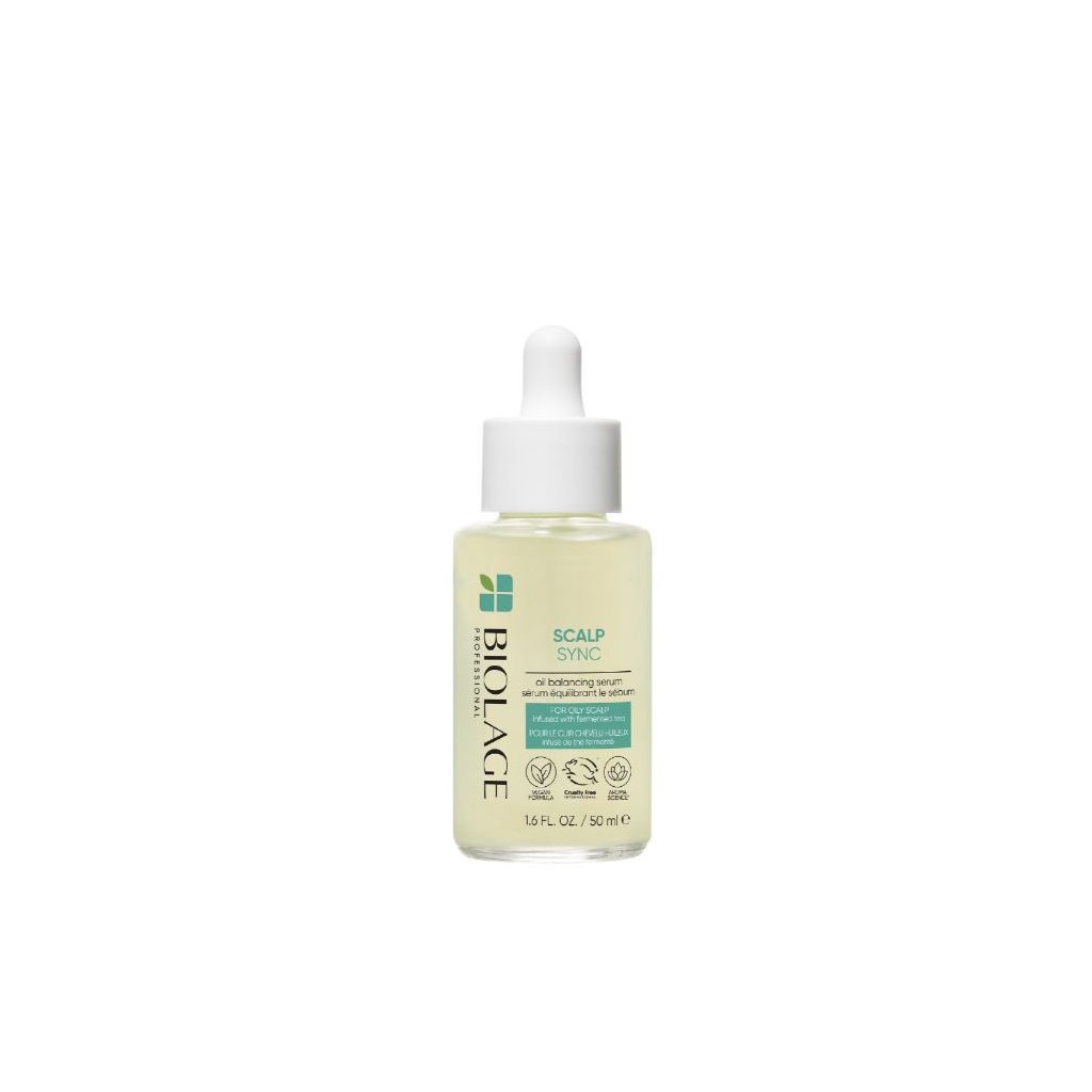 Sérum pro regulaci mastnoty vlasové pokožky Biolage Scalp Sync. Lehké bezoplachové sérum obohacené o fermentovaný čaj. Při použití v den mytí absorbuje a snižuje přebytečnou mastnotu, zanechává vlasy i vlasovou pokožku osvěžené až do dalšího mytí. Při pravidelném používání zabraňuje kožnímu mazu, aby se dostal z vlasové pokožky na vlasová vlákna. Pro pocit svěžesti a na pohled svěží vlasovou pokožku i vlasy.