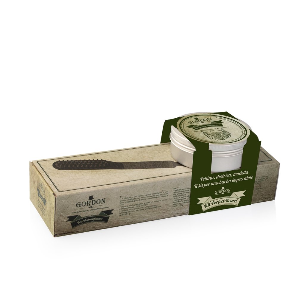 Sada Gordon Perfect Beard pro úpravu a tvarování vousů. Sada obsahuje změkčující krém na vousy a knír a žehličku na vousy.