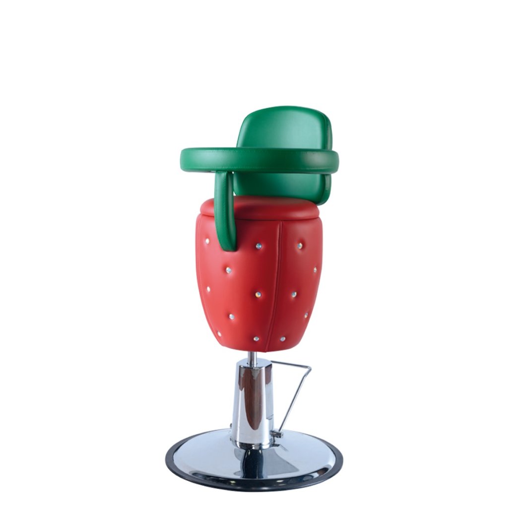 Dětské křeslo Fruit do kadeřnického salonu. FRUIT jsou měkké a snadno omyvatelné potahy v zářivých barvách, zdobené originálními krystaly připomínajícími semínka zralého ovoce (krystaly Swarovski®). Kolekce působí realisticky, jako by byla vyňata přímo z animáku pro nejmenší. S takovou kolekcí v salonu budou rodiče s velkým potěšením plánovat každou návštěvu pro své děti.
