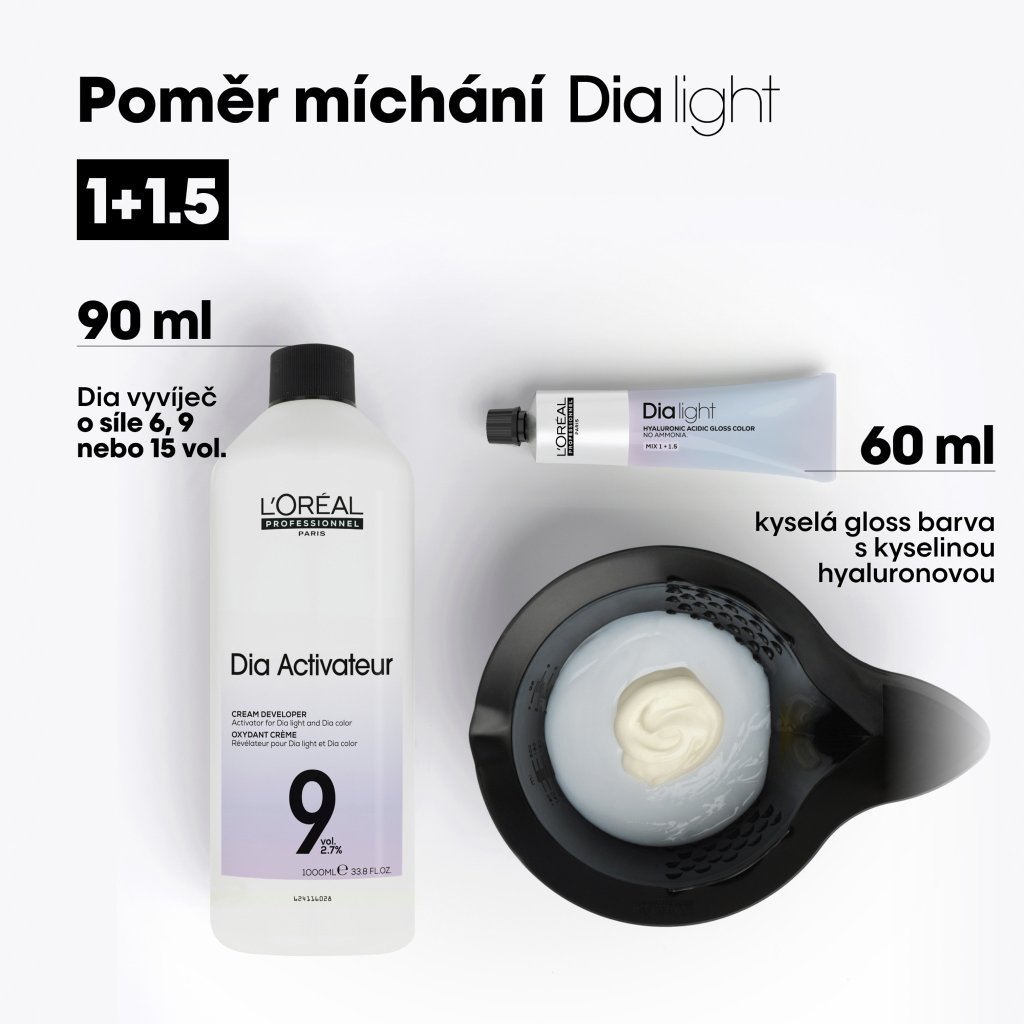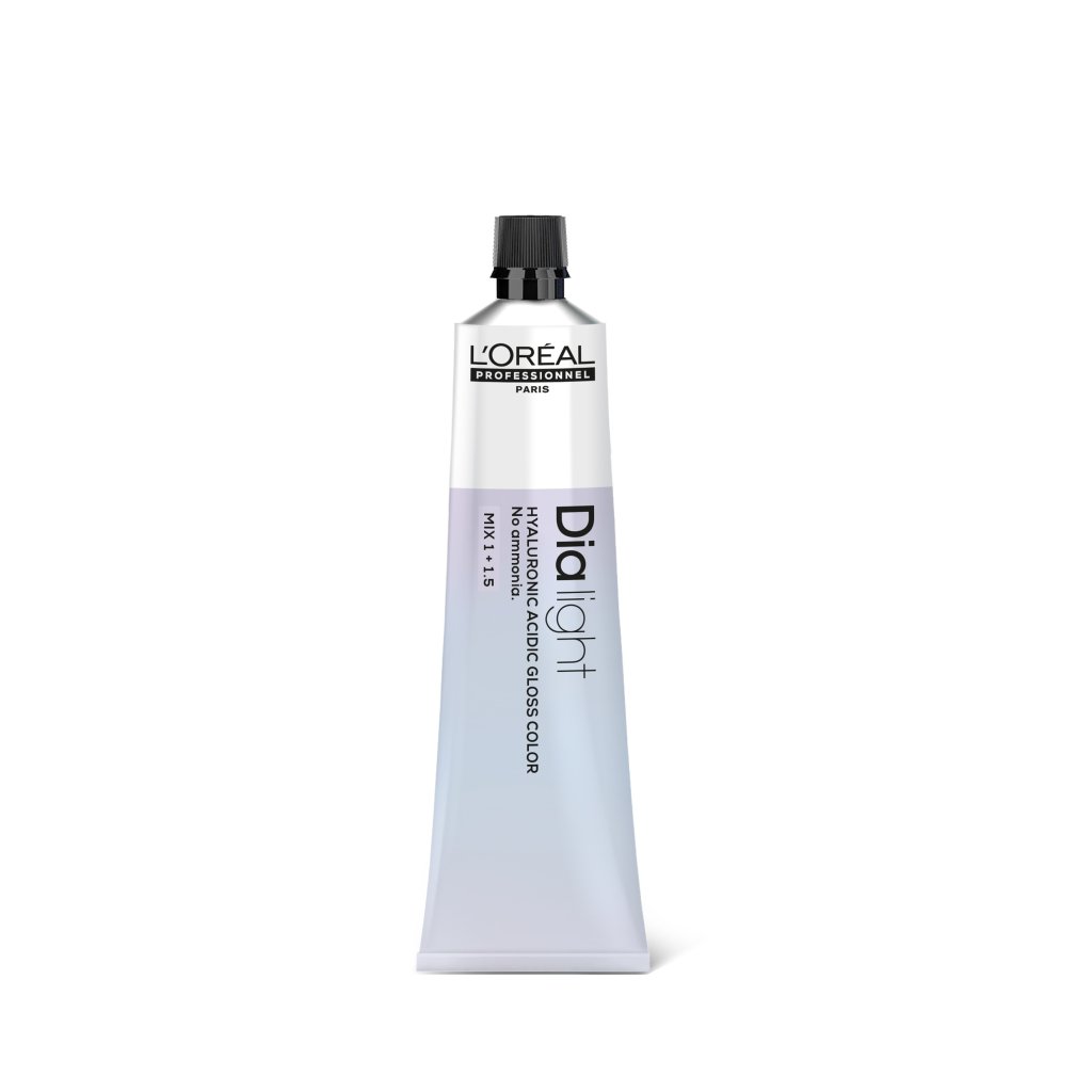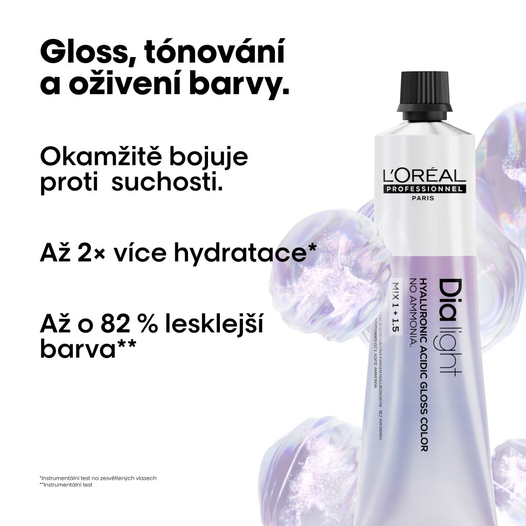 Demipermanentní kyselá gloss barva s kyselinou hyaluronovou L'Oréal Professionnel Dia Light – bez amoniaku. Kyselá gloss barva Dia light představuje průlomovou technologii pro dokonalý lesk, tónování a oživení barvy. První kyselá demipermanentní barva obohacená o kyselinu hyaluronovou, která okamžitě hydratuje v průběhu barvení a bojuje proti suchosti – jednomu z prvních viditelných příznaků poškození vlasů. Dia light neutralizuje základy zesvětlení po zesvětlení, jemně oživuje vybledlé délky po barvení a obnovuje lesk matných vlasů. Jedinečná kyselá technologie pro exkluzivní profesionální použití.