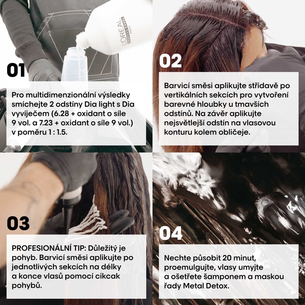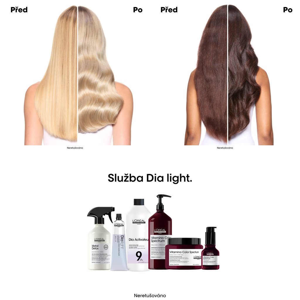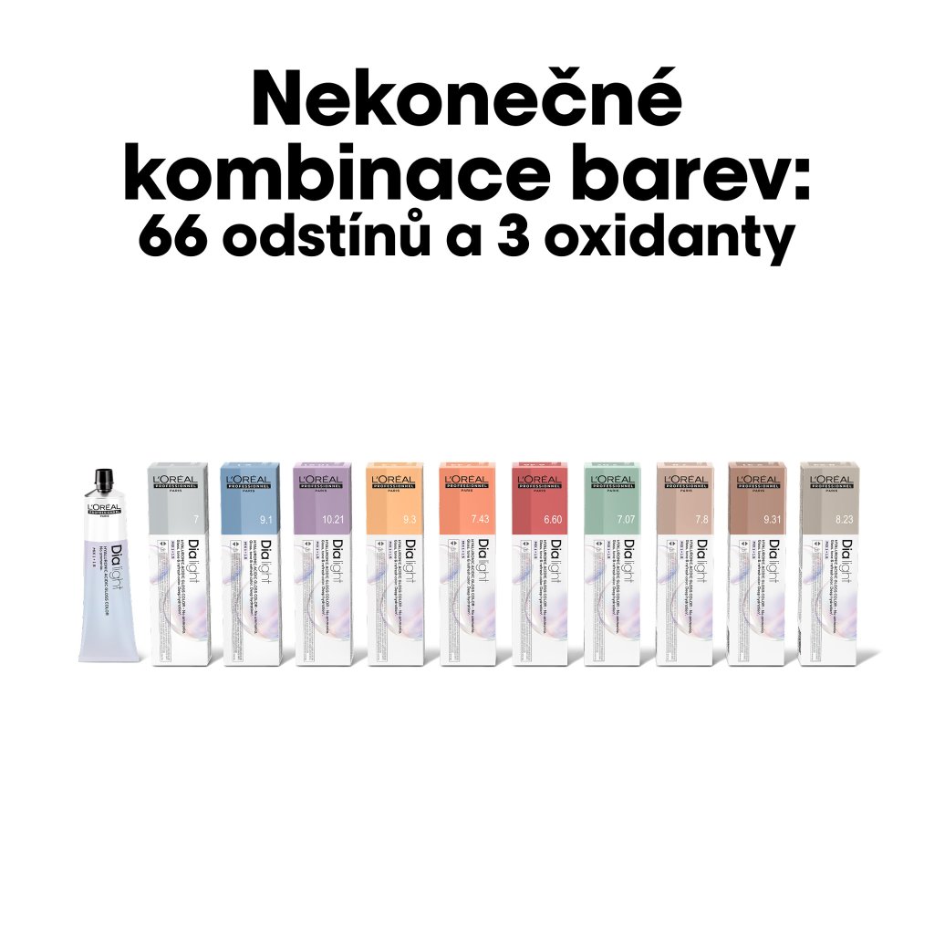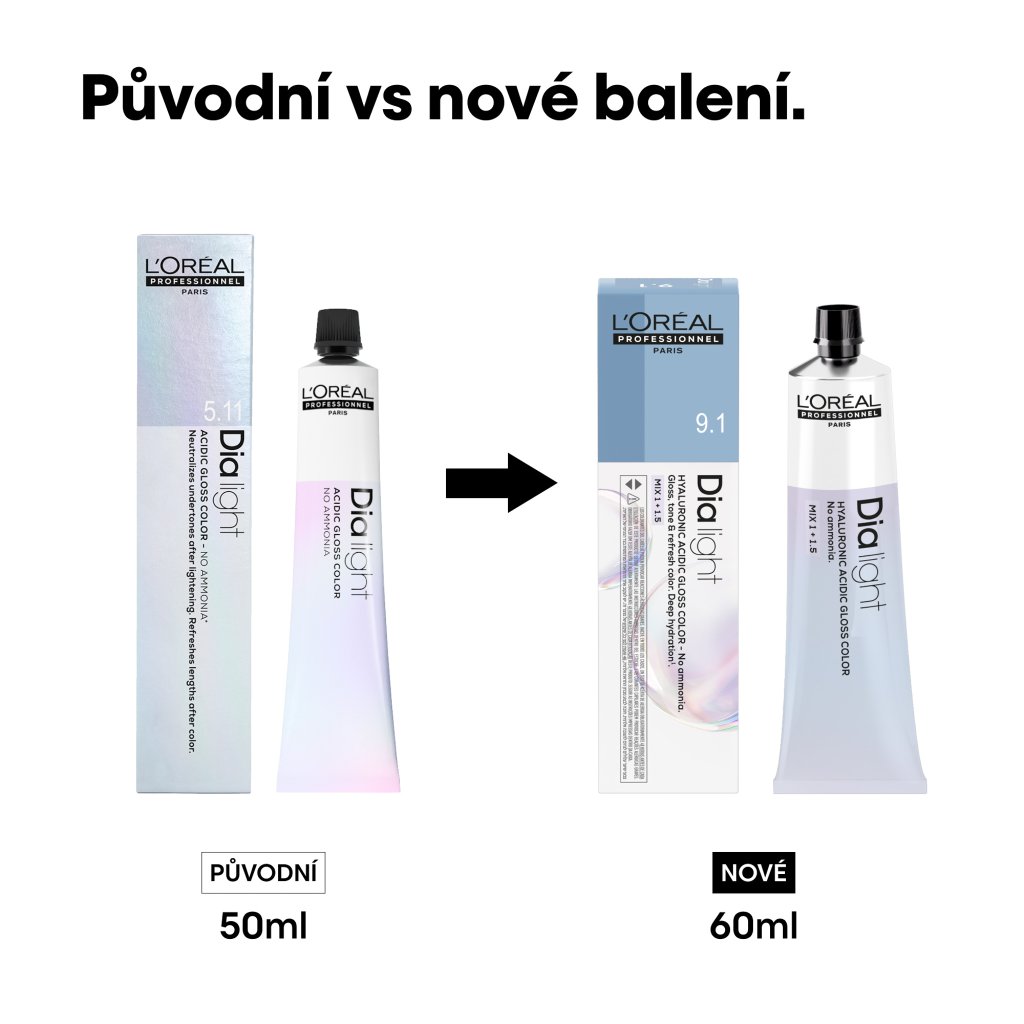 Demipermanentní kyselá gloss barva s kyselinou hyaluronovou L'Oréal Professionnel Dia Light – bez amoniaku. Kyselá gloss barva Dia light představuje průlomovou technologii pro dokonalý lesk, tónování a oživení barvy. První kyselá demipermanentní barva obohacená o kyselinu hyaluronovou, která okamžitě hydratuje v průběhu barvení a bojuje proti suchosti – jednomu z prvních viditelných příznaků poškození vlasů. Dia light neutralizuje základy zesvětlení po zesvětlení, jemně oživuje vybledlé délky po barvení a obnovuje lesk matných vlasů. Jedinečná kyselá technologie pro exkluzivní profesionální použití.