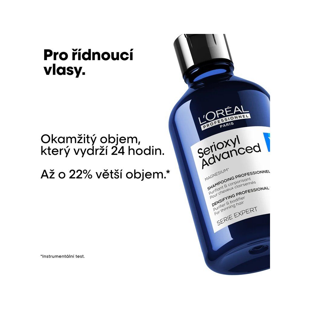 Profesionální čistící šampon se zhušťujícím efektem pro řídnoucí vlasy L'Oréal Professionnel Serioxyl Advanced. Tento lehký gelový šampon obohacený o hořčík šetrně myje a dodává pocit obnovené hustoty vlasů. Vlasy jsou hustší a zářivé. Pomáhá pročistit kořínky od nánosu, který může omezovat zdravý růst vlasů. Viditelné výsledky již po prvním umytí. Vhodný pro všechny druhy vlasů.