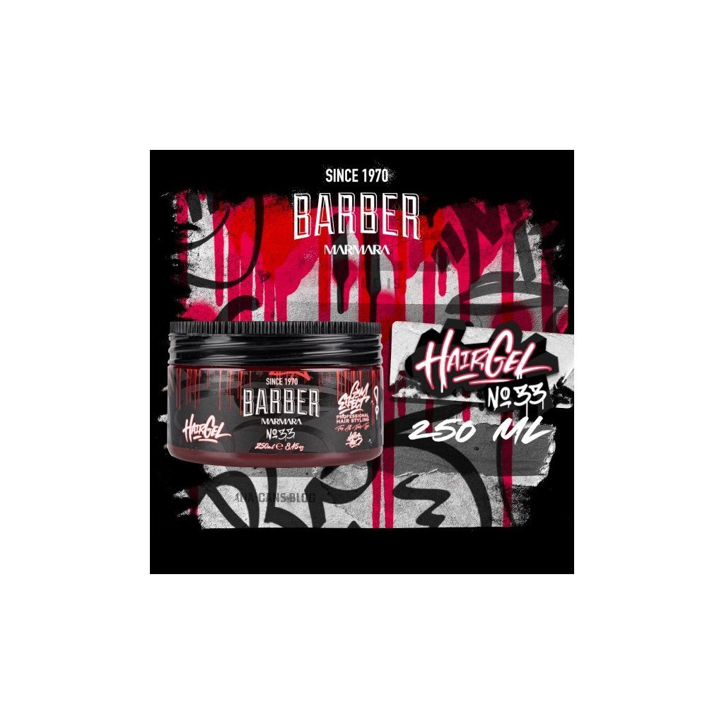 Pánský gel na vlasy Marmara Barber No. 33. Profesionální stylingový gel pro pánské salony, kadeřnictví i pro každodenní používání. Dodává maximální fixaci a lesk. Účes vydrží po celý den, aniž by zatěžoval vlasy a je rychleschnoucí. Vhodný pro všechny typy vlasů. Ideální pro moderní střihy, klasické i kreativní looky. Vhodný též pro ženské účesy. Elegantní a svěží vůně s jemně kořeněnými tóny.