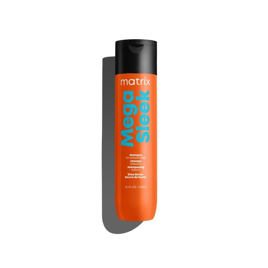 Matrix Total Results Mega Sleek šampon pro uhlazení a regeneraci vlasů jemně čistí a změkčuje strukturu vlasu. Vlasy jsou po použití poddajnější. Šampon je vhodný i pro barvené, suché a poškozené vlasy.