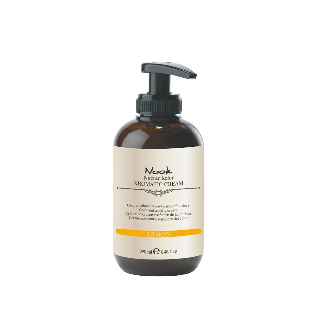 Barevná tónující maska na vlasy Nook Kromatic Cream bez amoniaku. Oživuje barvu přirozených i chemicky ošetřených vlasů. Vyživuje vlasové vlákno. Hydratuje a dodává lesk. Umožňuje vytvářet nekonečné barevné efekty na přírodních, obarvených nebo kosmeticky ošetřených vlasech. Obsahuje olej z Tea Tree, slunečnicových semínek a ovocné kyseliny. Odstín Lemon.