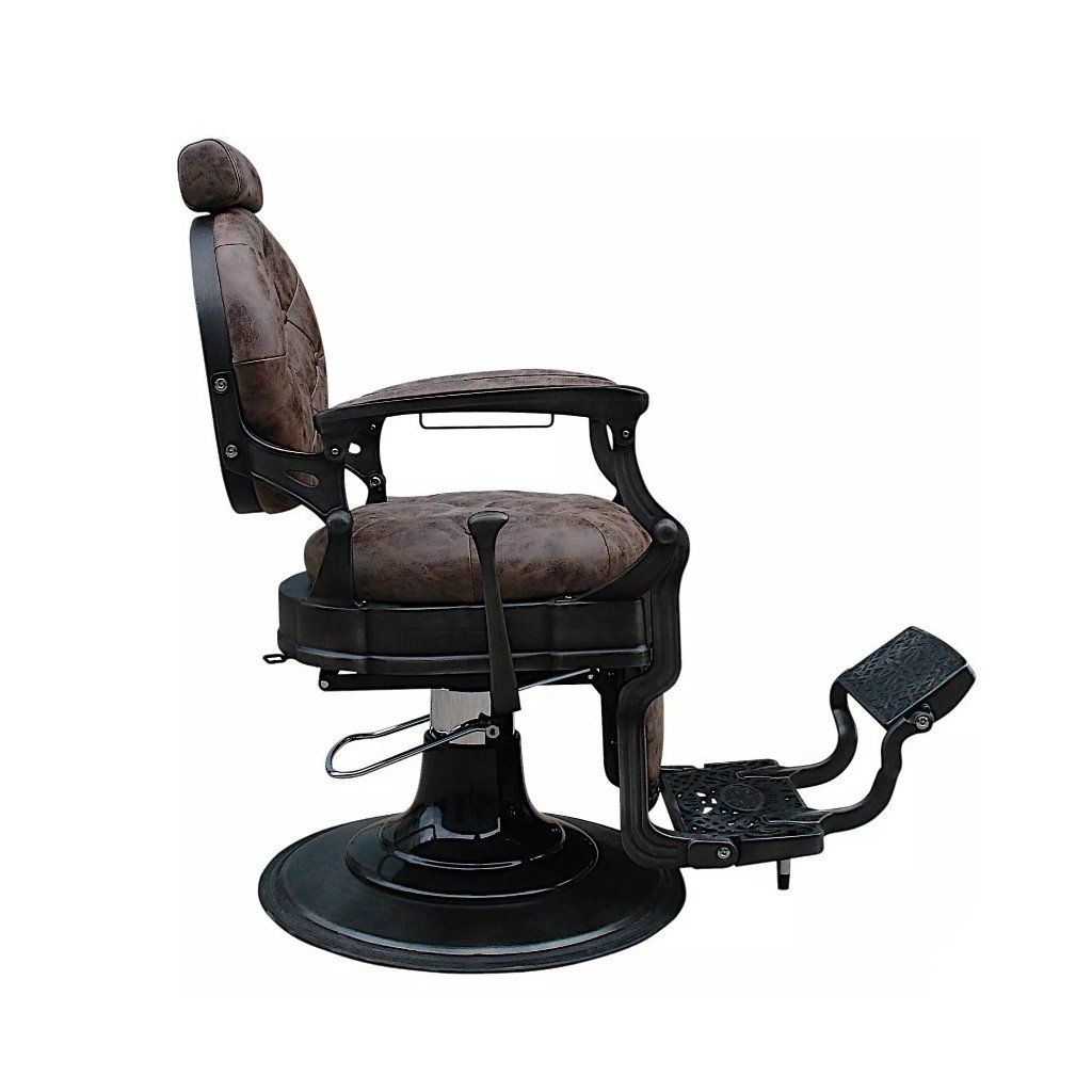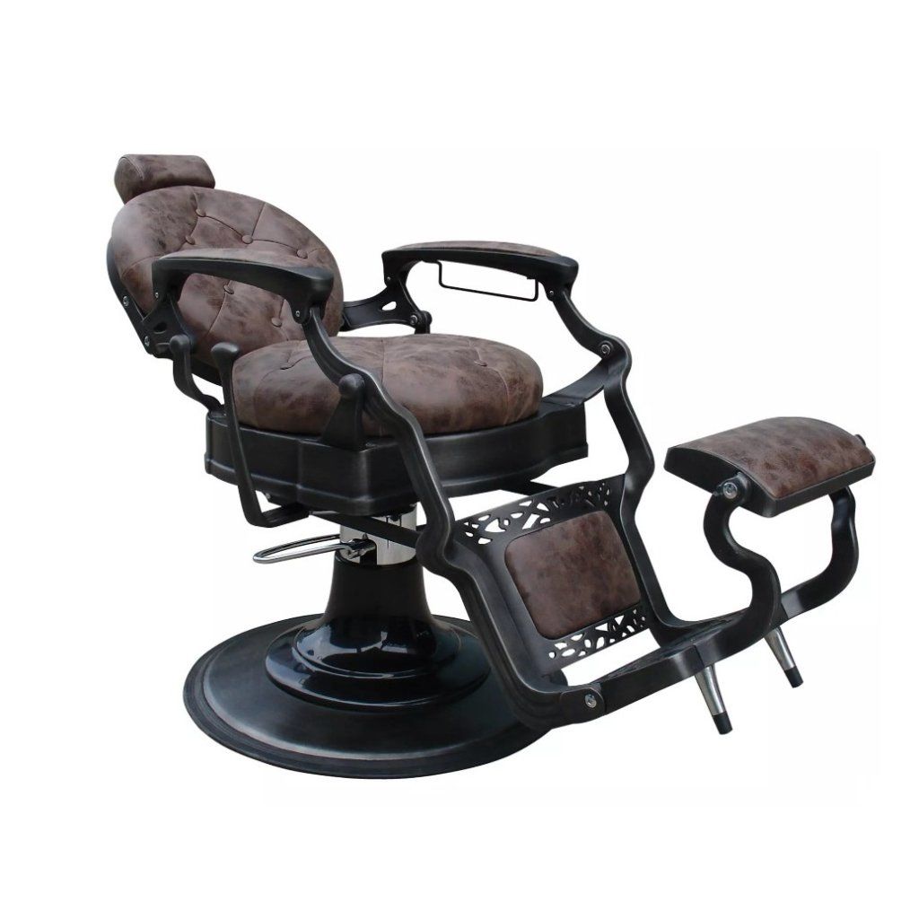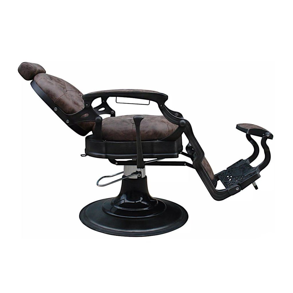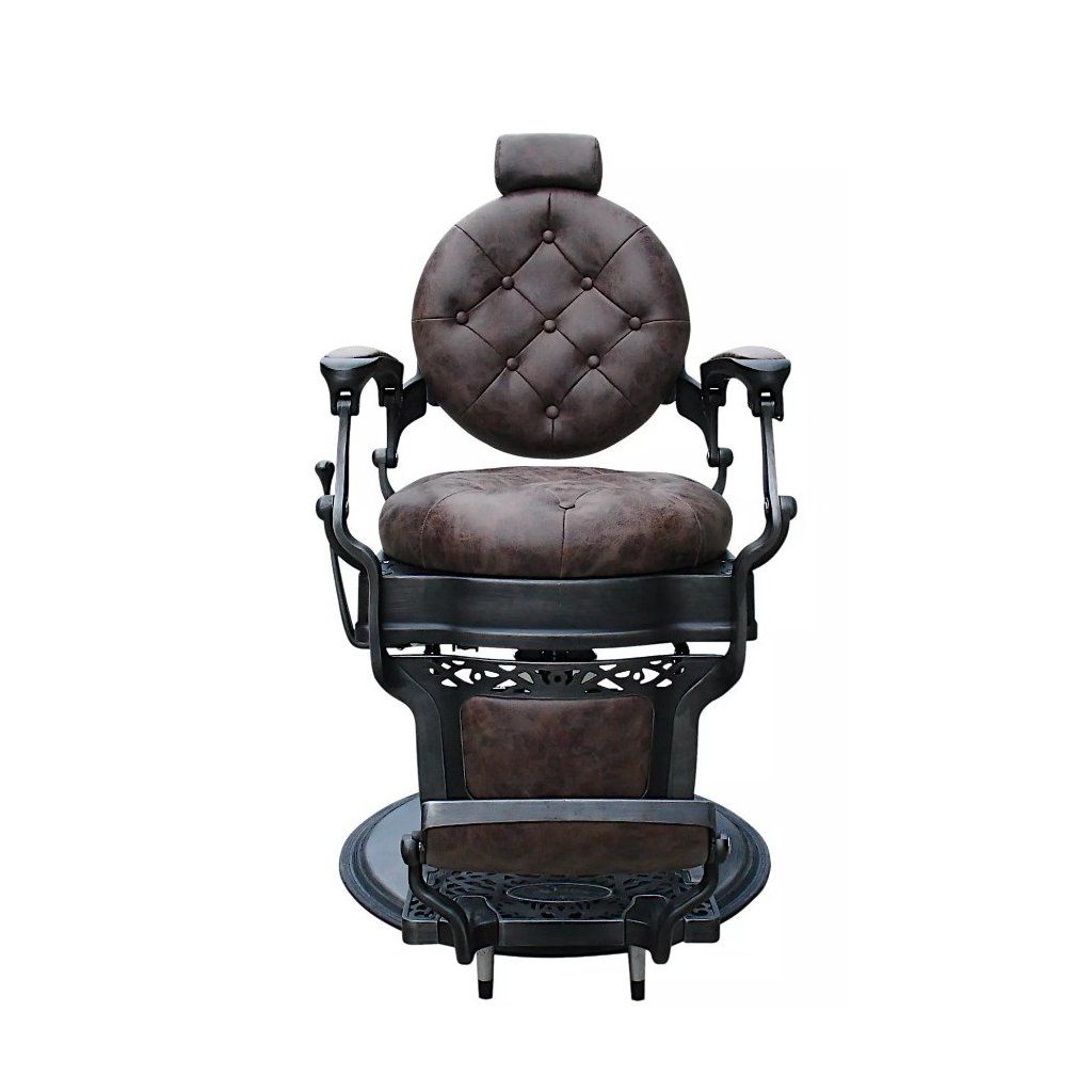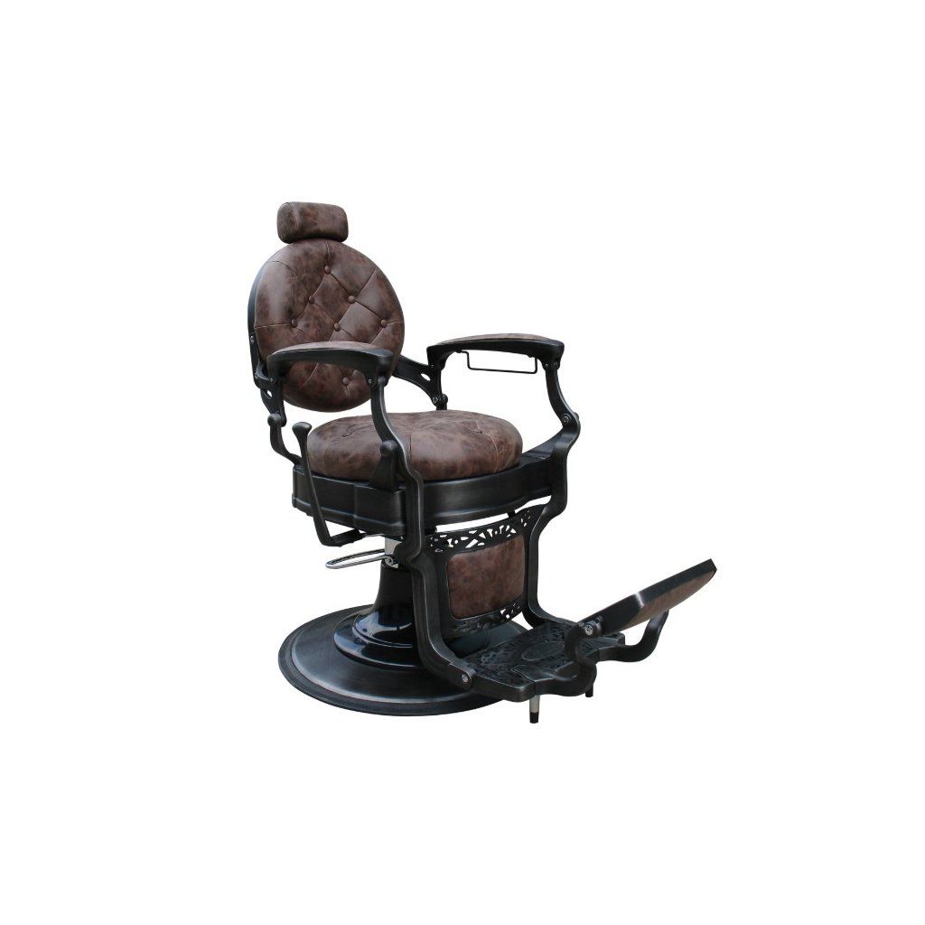 Profesionální Barber kadeřnické křeslo Malone do salonu. Nadčasový vintage design s prošívaným sedákem a opěradlem. Kovové detaily křesla a propracované opěrky dodávají punc originality. Barva křesla hnědá.