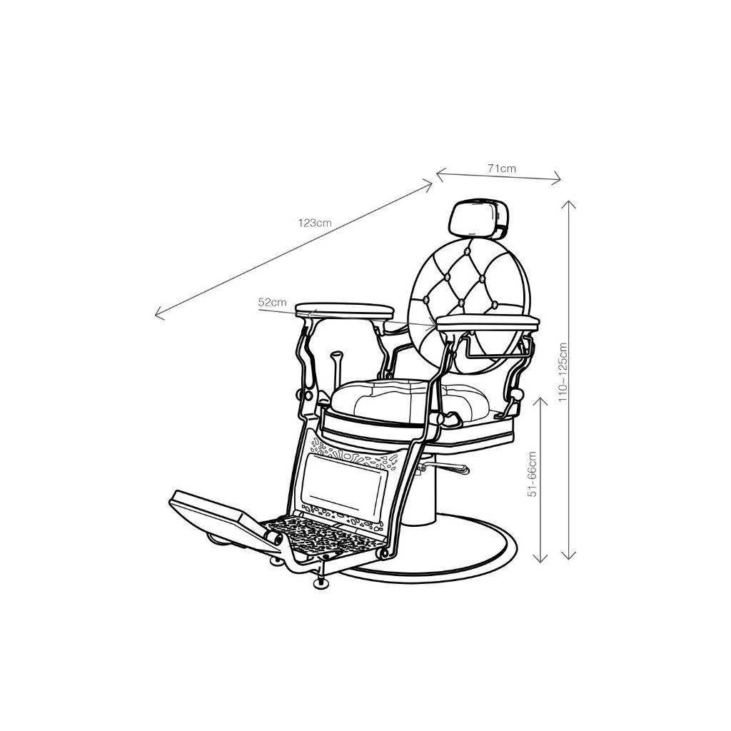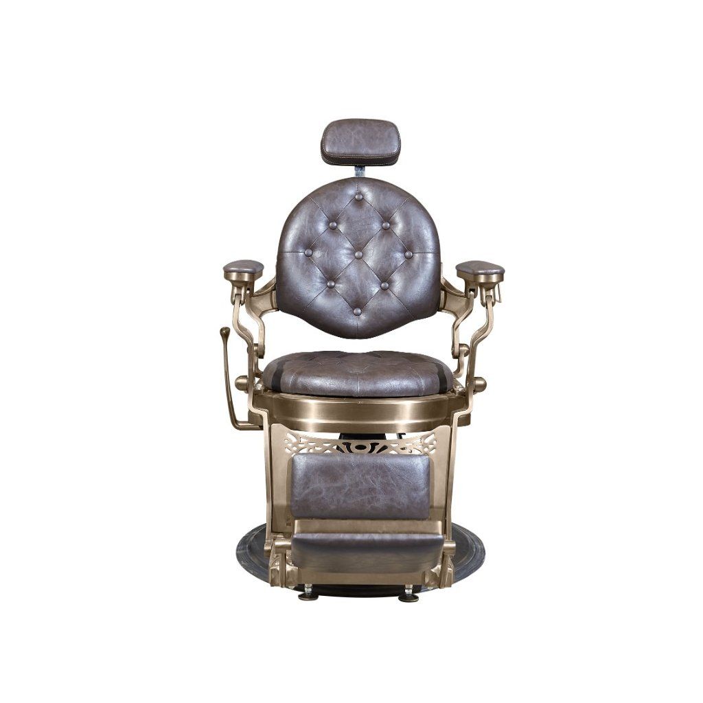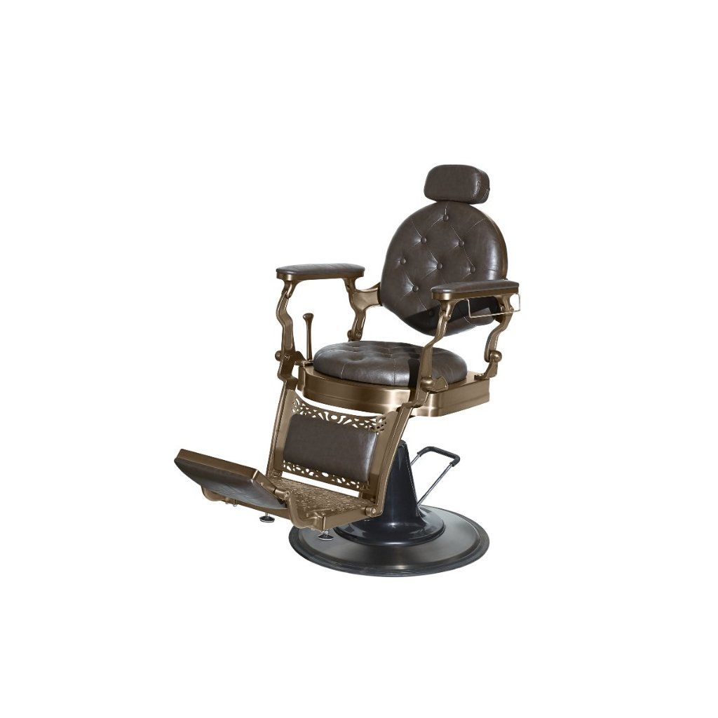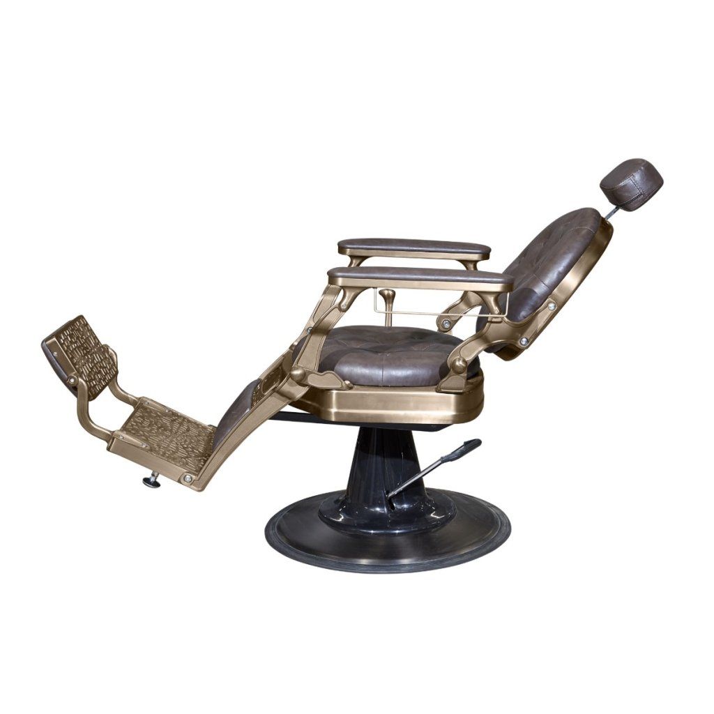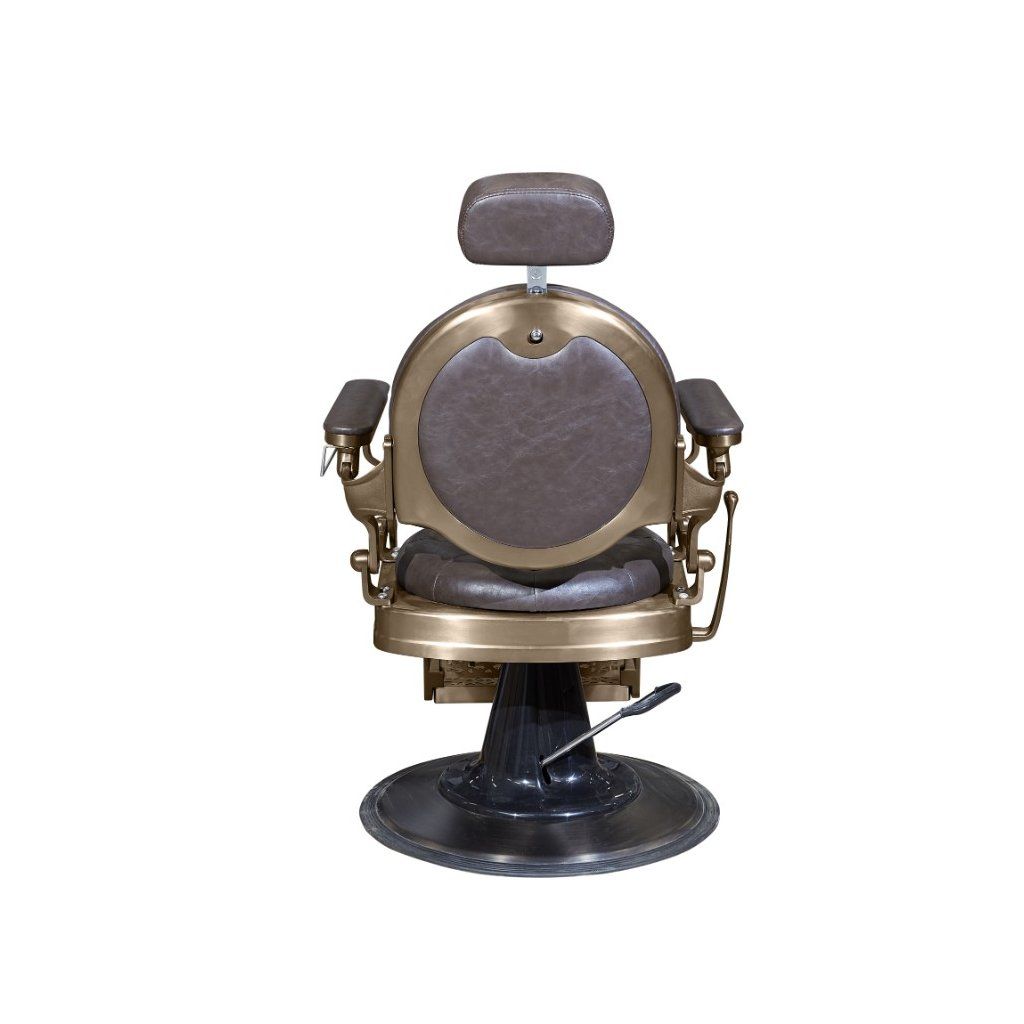 Profesionální Barber kadeřnické křeslo Malone II. do salonu. Bronzový vintage design s prošívaným sedákem a opěradlem. Kovové detaily křesla a propracované opěrky dodávají punc originality. Barva křesla hnědo-bronzová.
