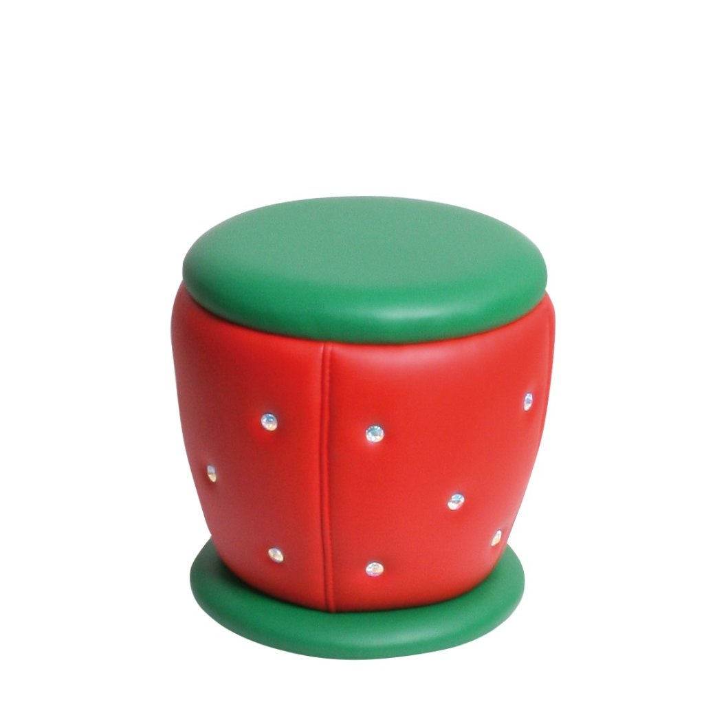 Dětský Puf Truskawka Fruit do kadeřnického salonu. FRUIT jsou měkké a snadno omyvatelné potahy v zářivých barvách, zdobené originálními krystaly připomínajícími semínka zralého ovoce (krystaly Swarovski®). Kolekce působí realisticky, jako by byla vyňata přímo z animáku pro nejmenší. S takovou kolekcí v salonu budou rodiče s velkým potěšením plánovat každou návštěvu pro své děti.