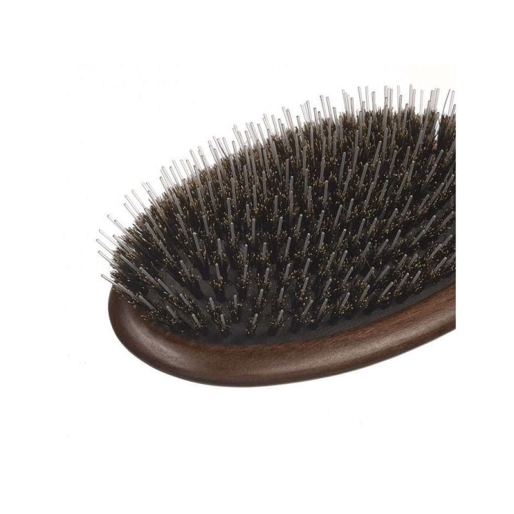 Dřevěný kartáč s nylonovými hroty a 100% štětinami z kanců snadno rozčesává zacuchané vlasy. Zároveň masíruje pokožku hlavy a zanechává vlasy hebké a lesklé. Zabraňuje poletování vlasů. Vhodný na prodloužené vlasy. Velikost L, délka kartáče je 23,5 cm.