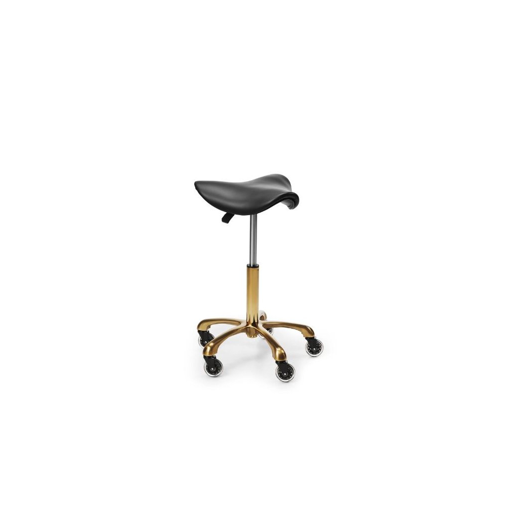 Profesionální taburet 360 na zlatém kříži do kadeřnického salonu. Nastavitelná sedlová stolička s plynovým pístem. Úzká základna a gumová kolečka pro plynulý pohyb bez hluku a potíží. Sedák z odolné PU kůže. Můžete sedět v libovolném směru.