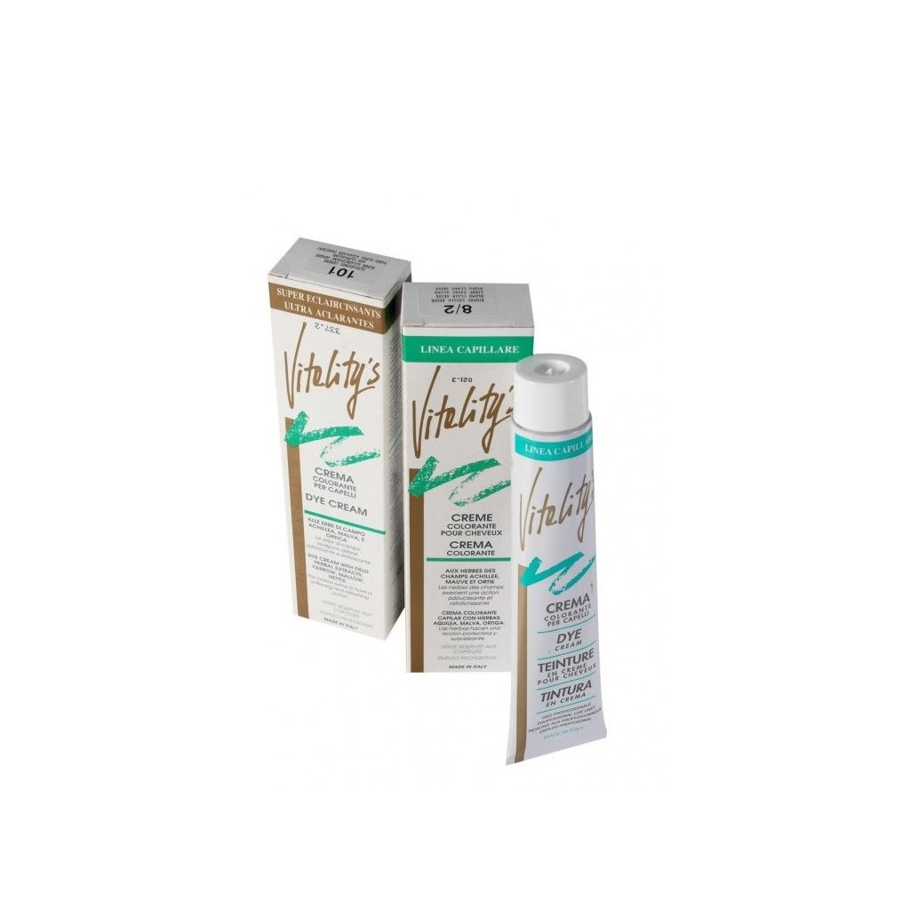 Vitality's Green barva s výtažky z bylin maximálně ochraňují vlasy a zklidňují pokožku. Dodávají vlasům lesk, zaručují kompaktní probarvení a 100% krytí bílých vlasů. Poměr míchání 1 + 1,5 pro přírodní a módní odstíny. 1 + 3 pro ultra blond odstíny.