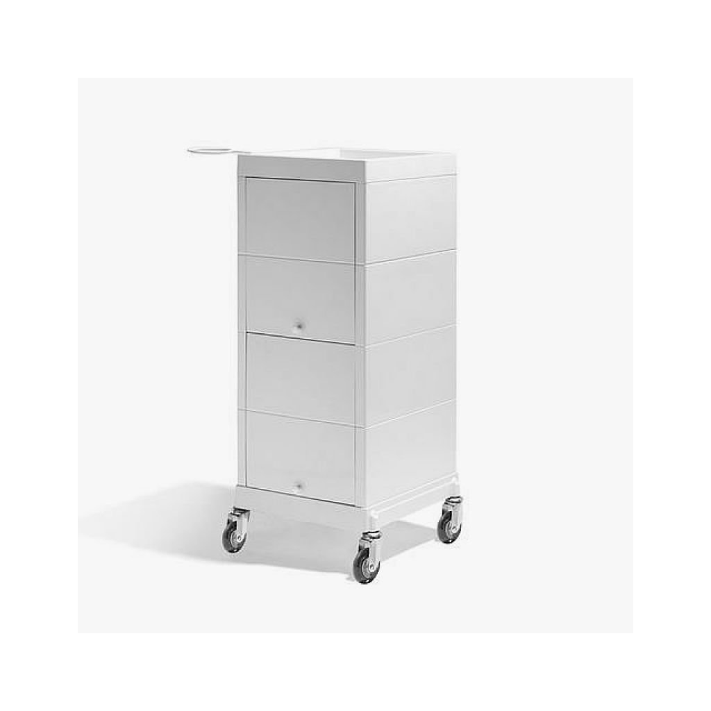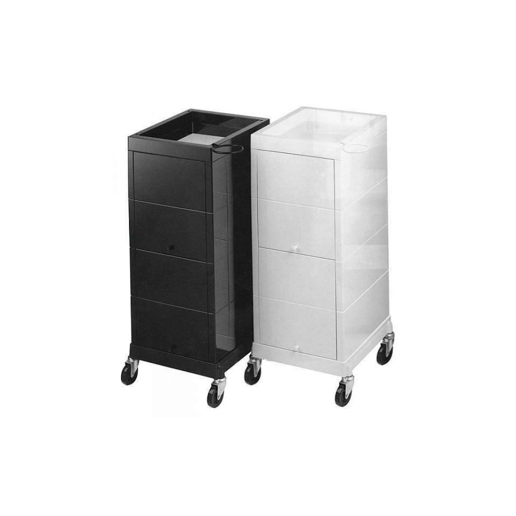 Kadeřnický vozík v černé nebo bílé barvě. Je uzavřen ze všech 4 stran, takže se do šuplíků nedostávají zbytečné nečistoty a také působí elegantním a uklizeným dojmem. Vozík má speciální kolečka do kterých se nedostávají vlasy.
