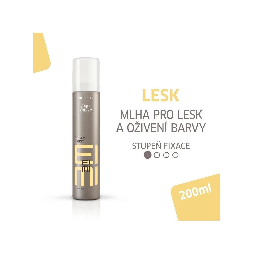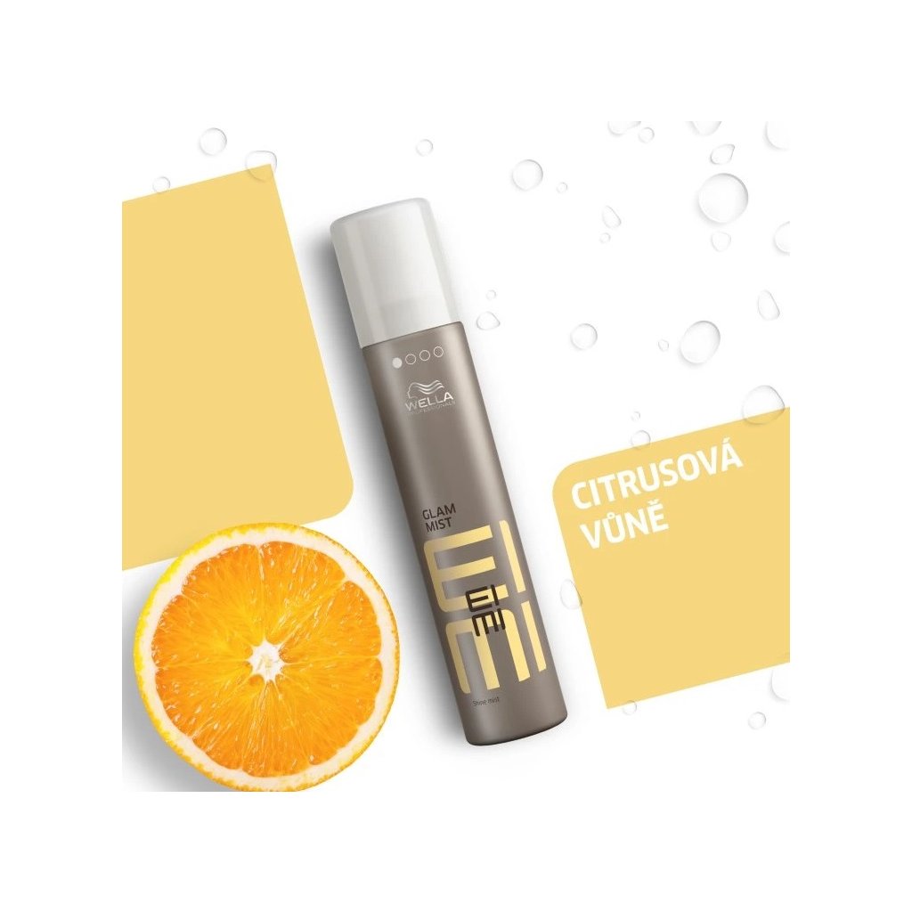 Stylingový lesk ve spreji Wella Professionals Eimi Glam Mist. Jeho složení chrání vlasy před účinky vlhkosti a UV záření. Přirozeně účes vyhladí a vlasy hydratuje. Vhodný pro všechny typy vlasů. Stupeň fixace 1.